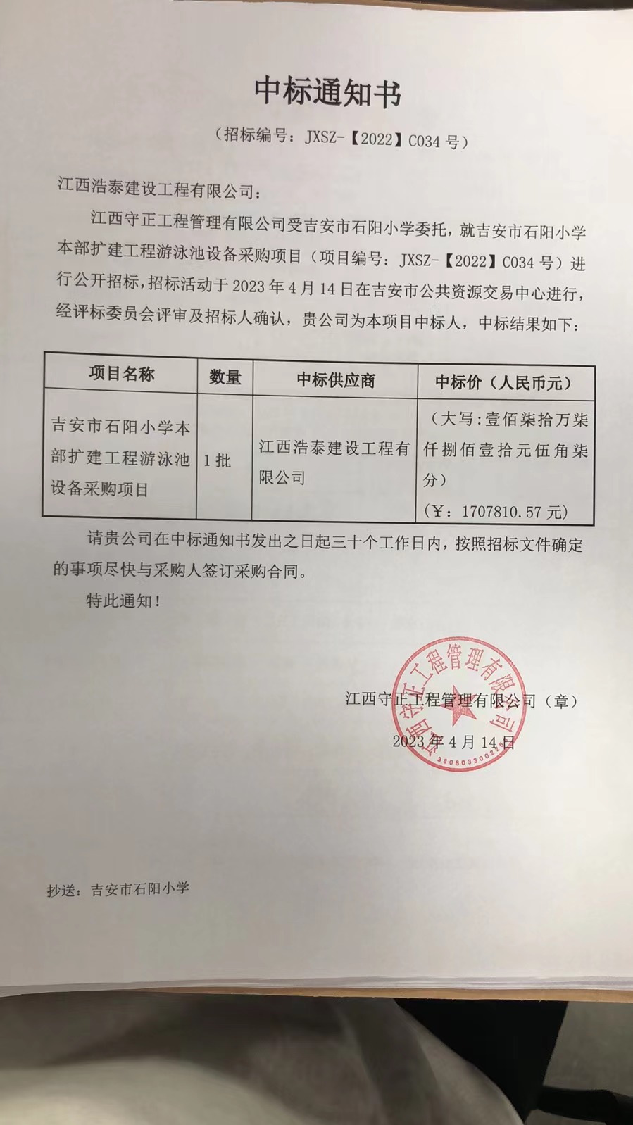 江西守正工程管理有限公司关于吉安市石阳小学本部扩建工程游泳池设备采购项目结果公示
