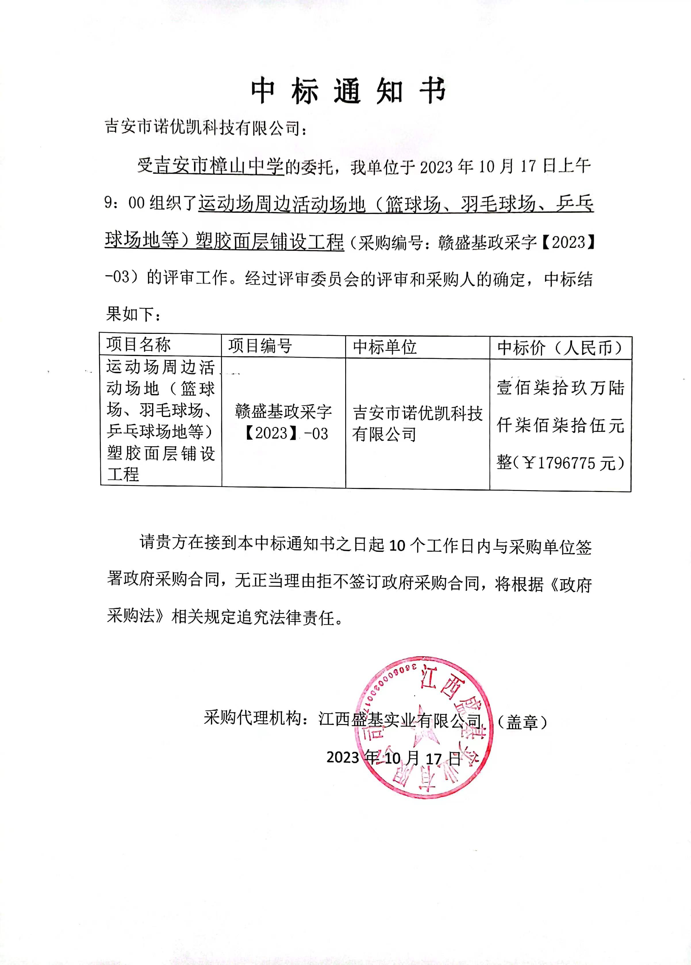 名称 :运动场周边活动场地(篮球场、羽毛球场、乒乓球场地等)塑胶面层铺设工程 施工范围:吉安市樟山中学校内 施工工期:自采购合同签订后30天内完成施工 项目经理:/ 执业证书信息:/