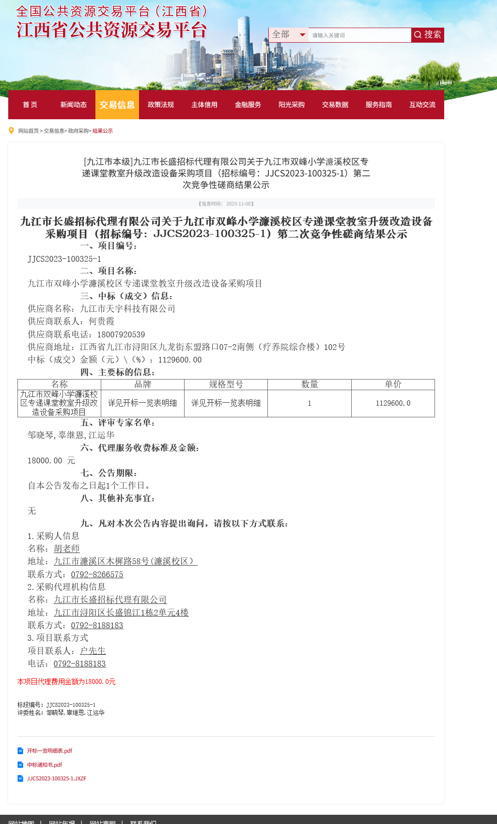 九江市长盛招标代理有限公司关于九江市双峰小学濂溪校区专递课堂教室升级改造设备采购项目(招标编号:JJCS2023-100325-1)第二次竞争性磋商结果公示