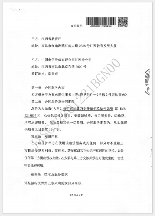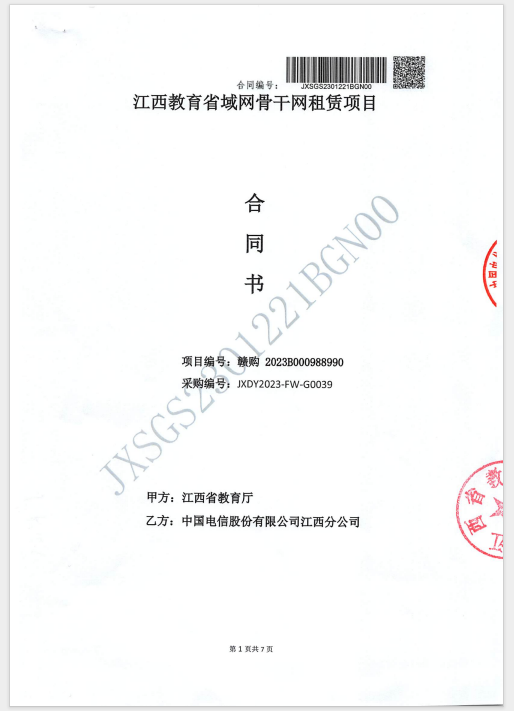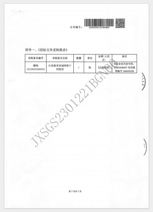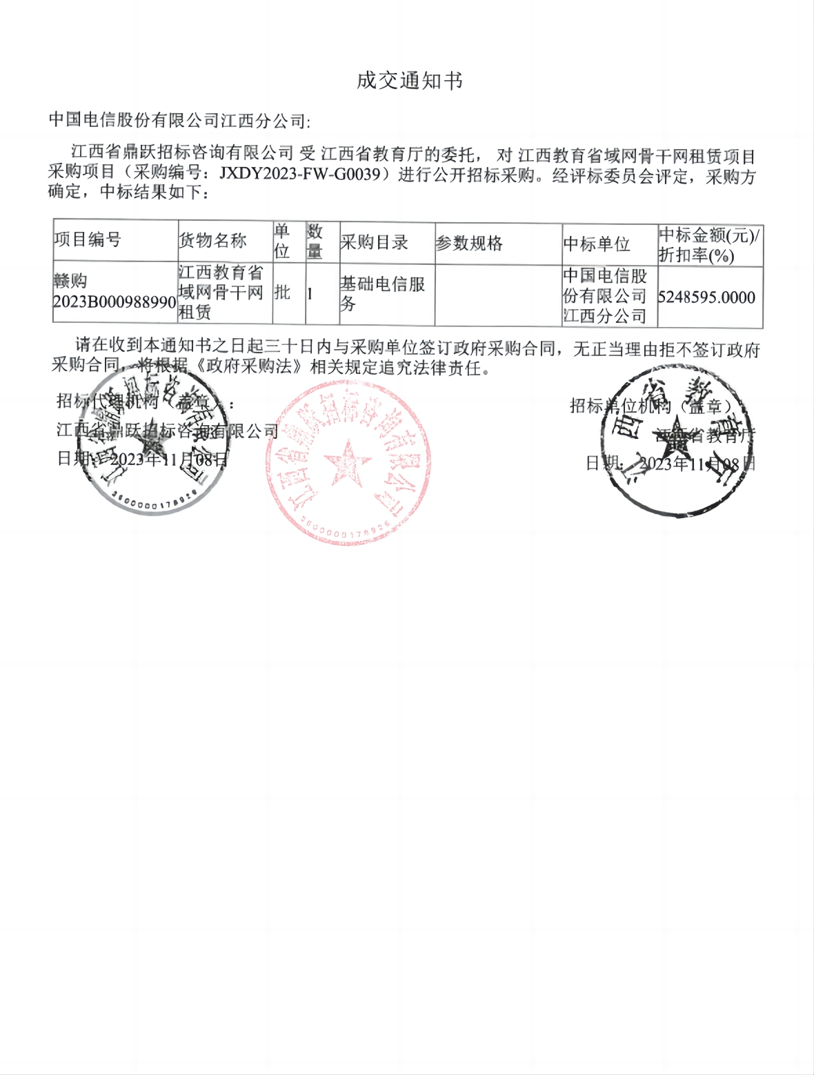 | 江西教育省域网骨干网租赁 | 江西教育省域网骨干网租赁 | 由中标人提供验收报告,验收报告均应符合国家相关标准。项目由采购人组织专家现场验收 | 自合同签订后15天内完成 | 按照《江西省教育专网建设指南(试行)》《关于确定江西省教育专网节点学校的通知》《关于规范江西省教育专网私有IP 地址使用的通知》等有关文件要求,采取有效措施,确保教育专网安全运行、健康发展。 |