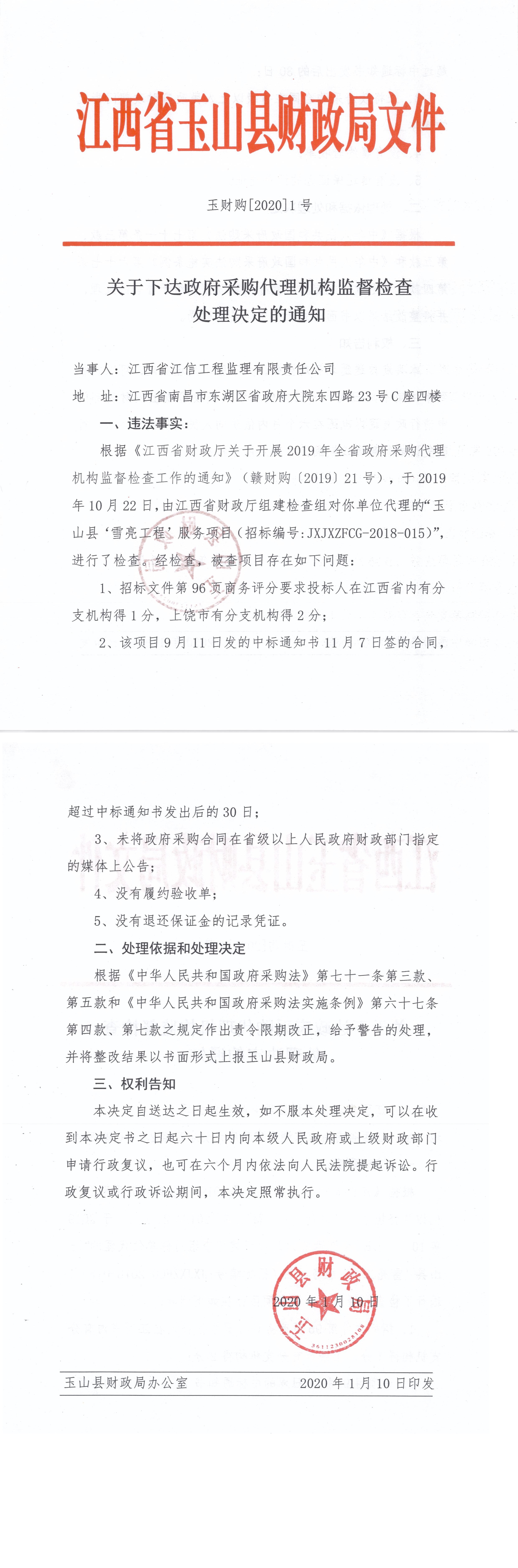 政府采购监督检查处理决定(玉财购【2020】1号)