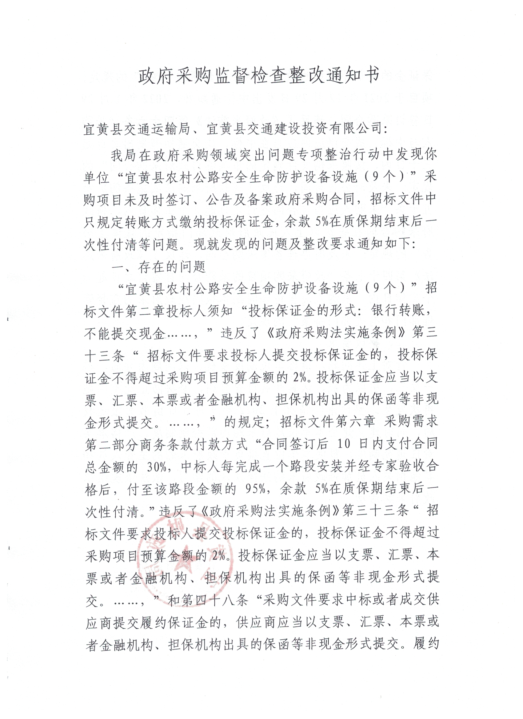 我局在政府采购领域突出问题专项整治行动中发现你单位“宜黄县农村公路安全生命防护设备设施(9个)”采购项目未及时签订、公告及备案政府采购合同,招标文件中只规定转账方式缴纳投标保证金,余款5%在质保期结束后一次性付清等问题。现就发现的问题及整改要求通知如下: