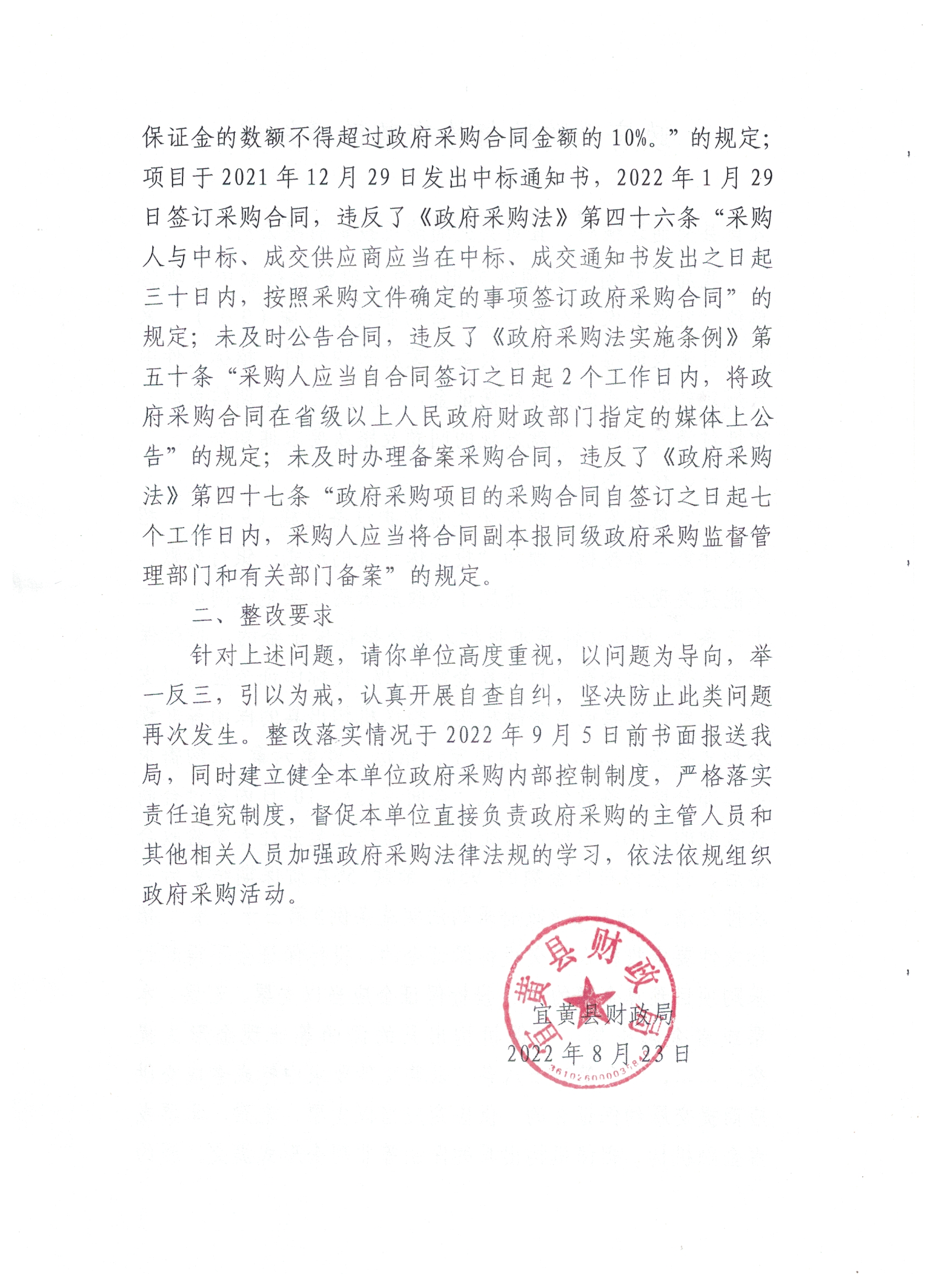 针对上述问题,请你单位高度重视,以问题为导向,举一反三,引以为戒,认真开展自查自纠,坚决防止此类问题再次发生。整改落实情况于2022年9月5日前书面报送我局,同时建立健全本单位政府采购内部控制制度,严格落实责任追究制度,督促本单位直接负责政府采购的主管人员和其他相关人员加强政府采购法律法规的学习,依法依规组织政府采购活动。