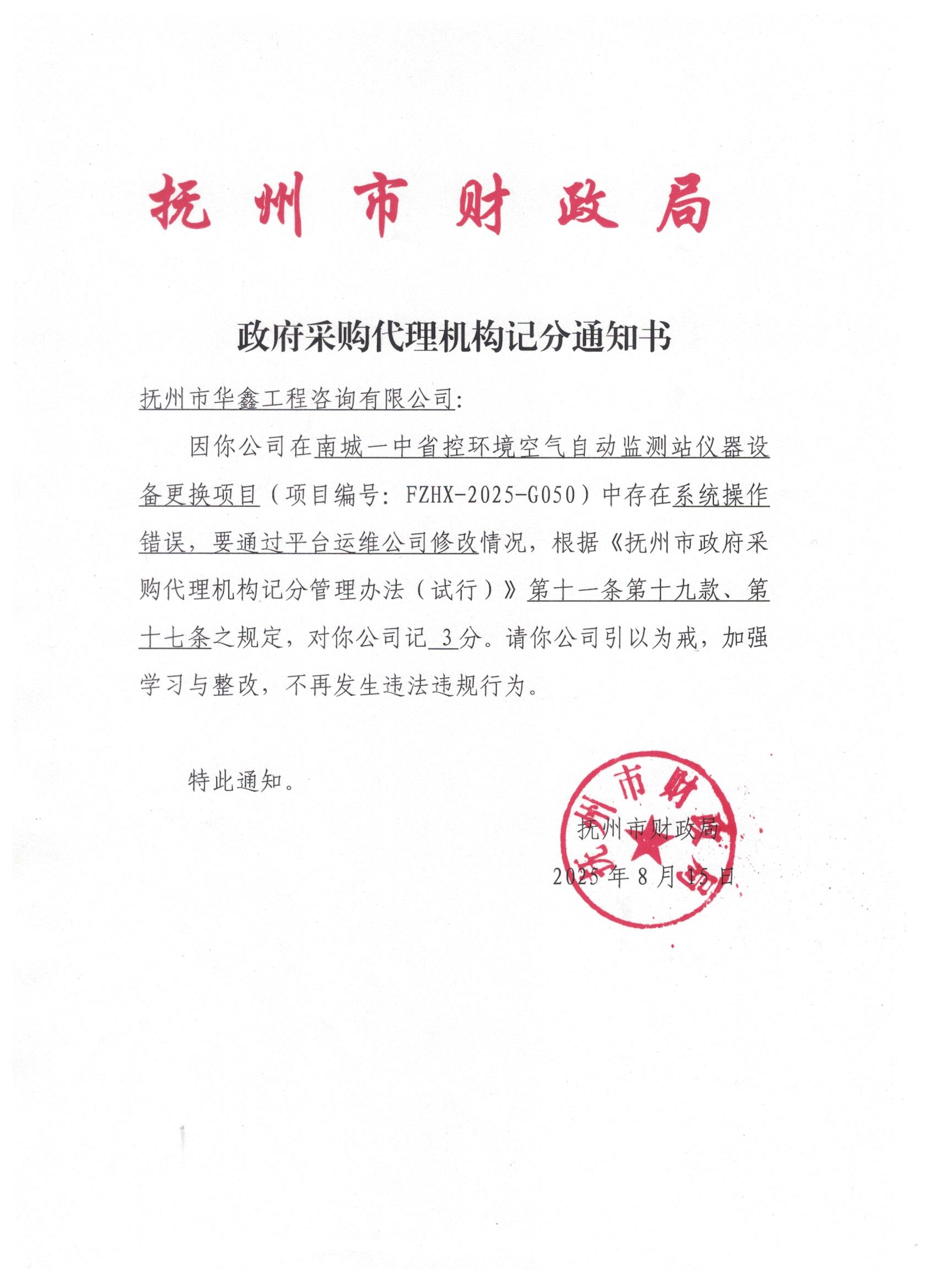 抚州市财政局政府采购代理机构记分通知书--抚州市华鑫工程咨询有限公司
