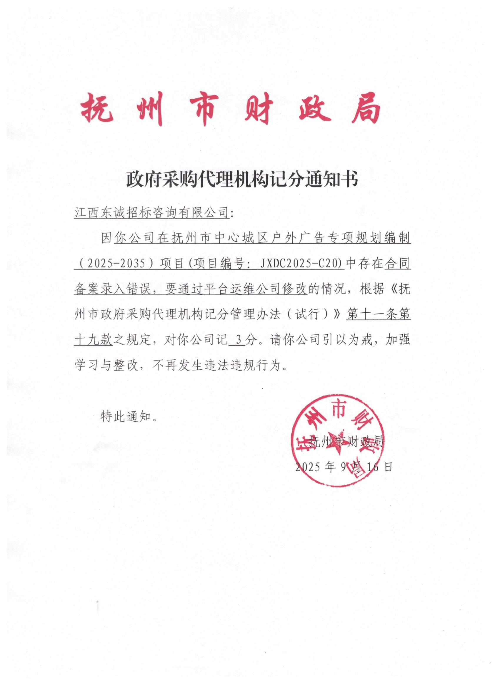 抚州市财政局政府采购代理机构记分通知书--江西东诚招标咨询有限公司