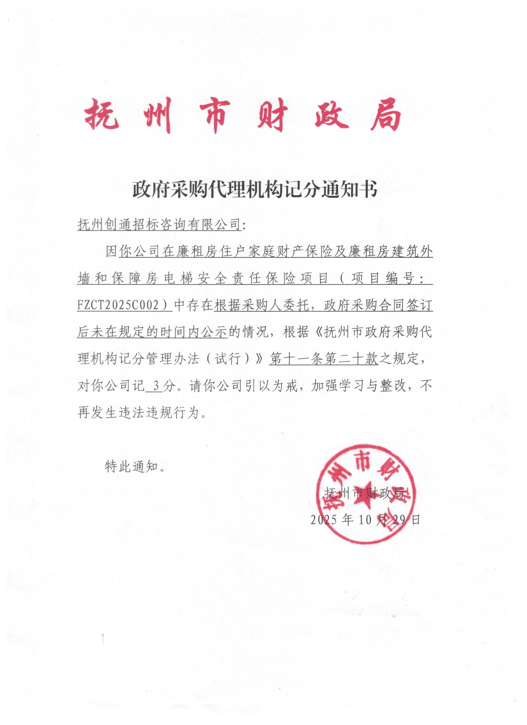 抚州市财政局政府采购代理机构记分通知书--抚州创通招标咨询有限公司